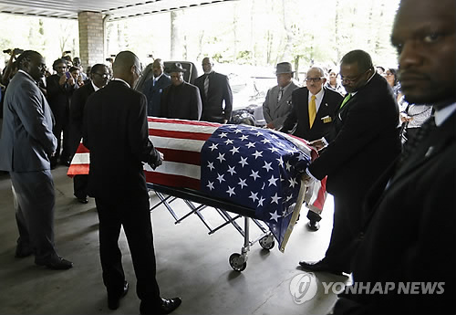 (서울=연합뉴스) 장재은 기자 = 백인 경찰의 권총 난사에 숨진 흑인의 장례식이 11일(현지시간) 인종차별을 성토하는 분위기 속에 열렸다.
