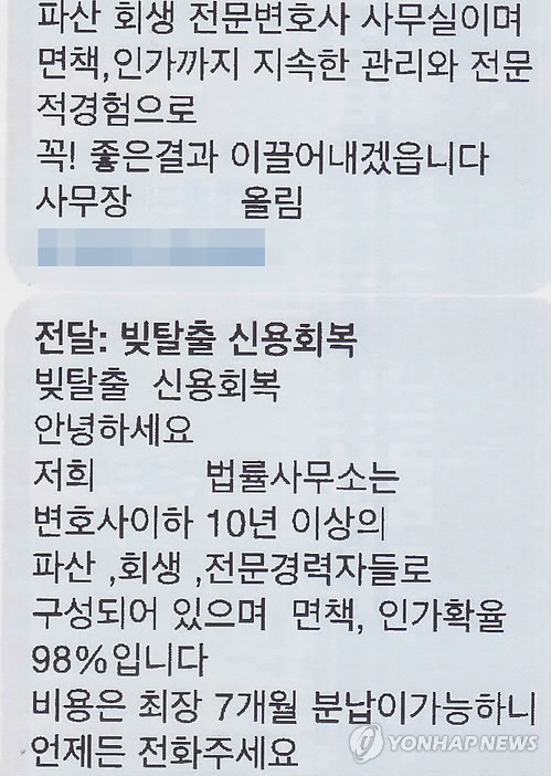 | △ 보따리 사무장이 보낸 파산회생 문자메시지 (부산=연합뉴스) 변호사 없이 사건 수임에 나서는 속칭 '보따리 사무장'이 보낸 문자메시지. 부산지방변호사회는 이런 보따리 사무장의 행태가 시민들에게 큰 피해를 일으킬 수 있다며 이들 사무장과 계약관계에 있는 변호사와 법무법인을 검찰에 고발했다. 2015.4.12 << 부산지방변호사회 >> osh9981@yna.co.kr |