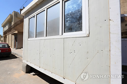 △ 총알 자국 선명한 경비초소 (트리폴리<리비아> EPA=연합뉴스) 리비아 수도 트리폴리에 있는 한국 대사관이 12일(현지시간) 수니파 무장조직 이슬람국가(IS) 연계 무장 괴한 세력의 기습 공격을 받아 대사관 경비원 2명이 숨지고 1명이 다쳤다. 대사관에서 근무하던 외교관 2명과 행정원 1명 등 한국인의 피해는 없는 것으로 확인됐다. 사진은 총알 자국이 선명한 대사관 밖 경비초소의 모습. 2010596@yna.co.kr