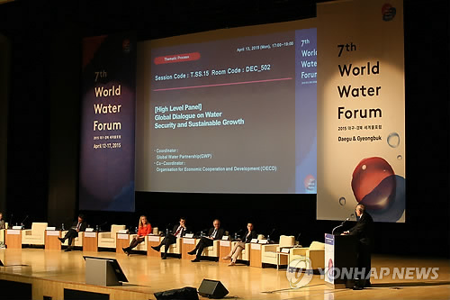 | △ '물 보안 및 지속 성장에 관한 글로벌 대담' (대구=연합뉴스) 박지호 기자 = 13일 오후 대구 EXCO에서 2015 대구·경북 세계물포럼 '물 보안 및 지속 성장에 관한 글로벌 대담' 세션이 진행되고 있다. 2015.4.13 jihopark@yna.co.kr |