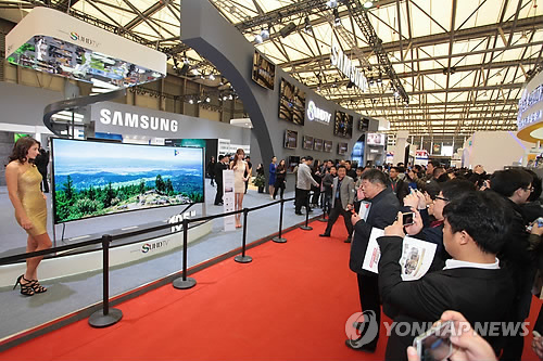 | △ 삼성전자는 지난 11일부터 14일까지 열린 중국 상하이 가전박람회에 참가, 2015년 형 SUHD TV로 중국가전협회 선정 '대상'을 수상했다고 밝혔다. 상하이 가전박람회가 열린 신국제박람센터에 전시된 삼성 SUHD TV. (삼성전자 제공) photo@yna.co.kr |