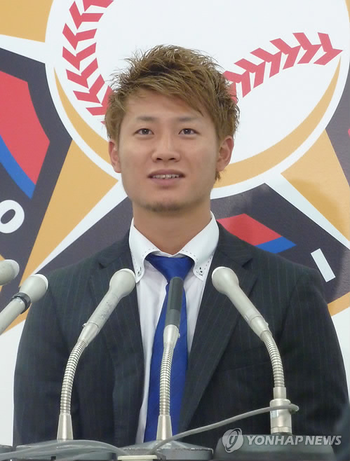 △ '타율은 1할, 출루율은 4할'…니혼햄 니시카와 하루키 (삿포로 교도=연합뉴스) 일본프로야구 퍼시픽리그 선두를 달리는 니혼햄 파이터스의 우투좌타 내야수 니시카와 하루키(23)가 선구안의 야구를 펼쳐보이고 있다. 니시카와는 14일 현재 팀의 13경기 중 10경기에 나와 32타수 6안타로 타율 0.188에 그쳐 규정 타석을 채운 타자 42명 중 타율 34위에 머물렀지만 출루율은 0.422로 팀 내 1위를 달리고 있다. 사진은 지난해 12월2일 일본 홋카이도(北海道) 삿포로(札晃) 시내 구단 사무실에서 기자회견하는 니시카와. 2015.4.14 chungwon@yna.co.kr