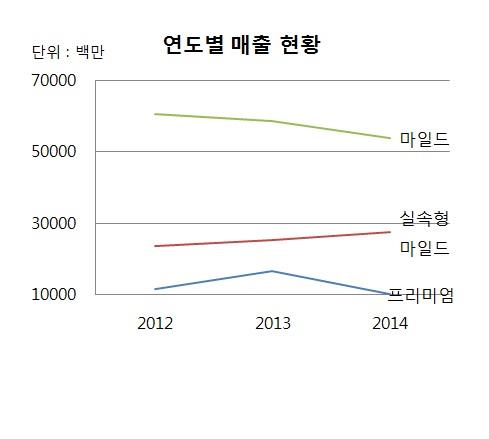그러나 이 기간 이보다 한단계 고급형인 마일드 시장은 12%, 지난해 최상위인 프리미엄 세제 시장규모는 2013년에 비해 40% 줄었다.