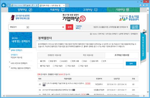 중소기업 정책정보 종합포털(www.1357.go.kr)에서 제공되는 이 서비스는 14개 부처와 17개 지자체가 펼치는 중소기업 지원사업에 정책등록번호를 부여하고 ▲ 정책 차림표 ▲ 미리 보는 지원사업 ▲ 마감임박 지원사업 ▲ 접수 중인 지원사업 등으로 분류된다.