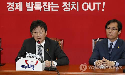 | △ 새누리당 유승민 원내대표가 14일 오후 국회에서 긴급 최고위원회의 결과를 취재진에게 설명하고 있다. |