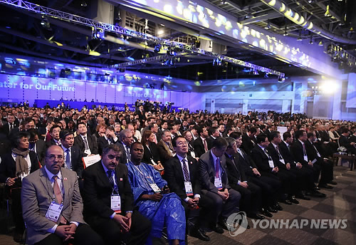 △ 제7차 세계 물포럼 개회식 (대구=연합뉴스) 도광환 기자 = 박근혜 대통령이 참석한 가운데 12일 오후 대구 엑스코에서 제7차 세계물포럼 개회식이 열리고 있다. 2015.4.12 dohh@yna.co.kr
