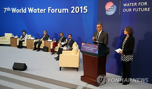 △ 대구경북 물 행동 전략 발표 (경주=연합뉴스) 한종찬 기자 = 14일 오후 경주 HICO에서 열린 2015 대구·경북 세계물포럼 제 4차 지방정부 회의 폐회 세션에서 바바라 안톤 이클레이 유럽본부 지속가능한 자원·기주변화와 회복력 담당관(오른쪽)과 모하메드 부스라우이 UCLG 세계본부가 '지속가능한 도시를 위한 대구경북 물 행동 전략 발표'를 하고 있다. 2015.4.14 saba@yna.co.kr