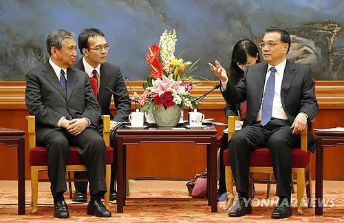 (도쿄=연합뉴스) 조준형 특파원 = 리커창(李克强) 중국 총리는 14일 고노 요헤이(河野洋平) 전 일본 관방장관이 이끄는 일본 국제무역촉진협회 방중단과 만나 양국 관계 개선에 대한 의욕을 보였다고 교도통신이 보도했다.