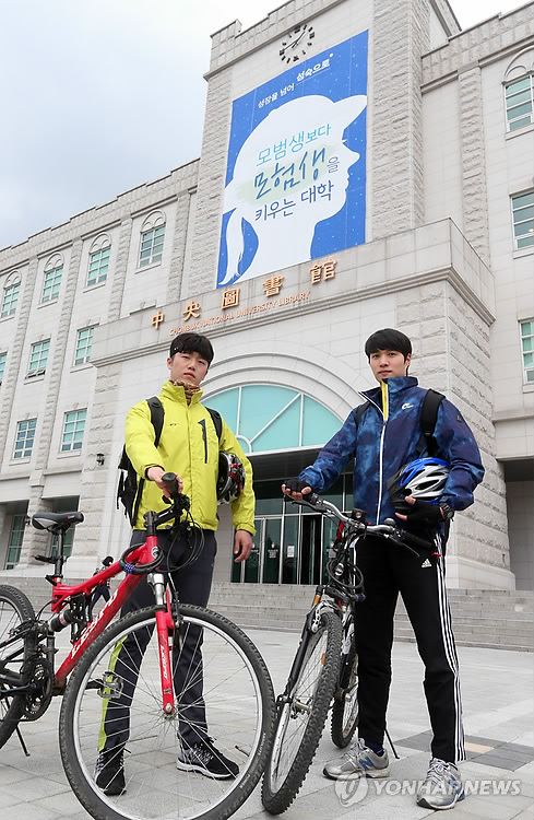 | △ 자전거로 미국횡단…두 청년의 '무모한도전' (전주=연합뉴스) 김진방 기자 = 자전거를 타고 미주 횡단에 도전하는 전북대학교 무역학과 이우찬(왼쪽), 정준호씨. 이들은 90일간 자전거를 타고 뉴욕에서 출발해 LA까지 미국 72개 도시를 거쳐 미주 횡단에 도전한다. 2015.4.15 chinakim@yna.co.kr |
