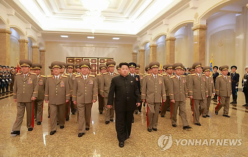 △ 북한 김정은, 김일성 생일 맞아 금수산태양궁전 참배 (서울=연합뉴스) 북한 김정은 국방위원회 제1위원장이 할아버지 김일성 주석의 103회 생일(태양절)인 15일 군 간부들을 대동하고 김일성·김정일의 시신이 안치된 금수산태양궁전을 참배했다고 노동신문이 보도했다. 황병서 군 총정치국장, 리영길 군 총참모장, 김원홍 국가안전보위부장, 김춘삼 작전국장, 박영식 총정치국 조직부국장, 조경철 군 보위사령관이 수행했다. 2015.4.15 nkphoto@yna.co.kr