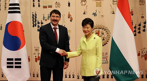 | △ 한-헝가리 정상 악수 (서울=연합뉴스) 도광환 기자 = 박근혜 대통령과 야노쉬 아데르 헝가리 대통령이 14일 오전 청와대에서 열린 정상회담에 앞서 악수하고 있다. 2015.4.14 dohh@yna.co.kr |