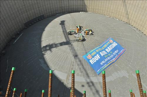강재 지붕을 저장탱크 바닥에서 제작해 압축공기로 부양시키는 첨단 '에어레이징(air raising)' 공법이 사용됐다.
