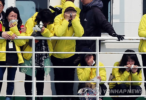 | △ 세월호 침몰 해역찾은 희생자 가족들 (진도=연합뉴스) 박철홍 기자 = 세월호 참사 1주년을 하루 앞둔 15일 오전 전남 진도 조도면 세월호가 침몰한 해역에서 세월호 희생자 가족들이 헌화하며 오열하고 있다. |