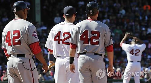 △ 15일(현지시간) 메이저리그 첫 흑인 선수인 재키 로빈슨을 기리는 '재키 로빈슨 데이'를 맞아 워싱턴과 보스턴 선수들이 그의 등번호인 42번을 달고 뛰고 있다.
