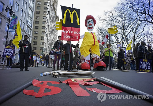 뉴욕에서는 100여 명에 달하는 시위대가 맥도날드를 비롯한 패스트푸드업체 매장을 돌며 시간당 임금 인상을 요구하는 시위를 벌였다.