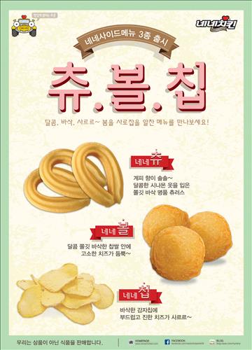 (서울=연합뉴스) 이유미 기자 = 치킨 프랜차이즈 네네치킨은 츄러스와 치즈볼, 감자칩 등 가볍게 먹을 수 있는 사이드 메뉴 3종을 출시했다고 16일 밝혔다.