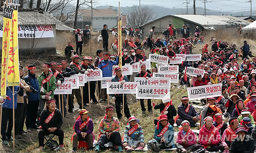 △ 포천주민 "사격장 소음 시끄러워 못살겠다" (포천=연합뉴스) 노승혁 기자 = 3일 오후 경기도 포천시 미8군 로드리게스 훈련장(영평사격장) 입구에서 영평·승진사격장 대책위 회원들과 인근 마을 주민들이 안전 대책을 요구하는 집회를 열고있다. 지난해 11월 이후 최근까지 사격장 너머 마을인 영북면에서만 총탄과 포탄이 떨어지는 사고가 세 차례 발생했다. 2015.4.3 nsh@yna.co.kr