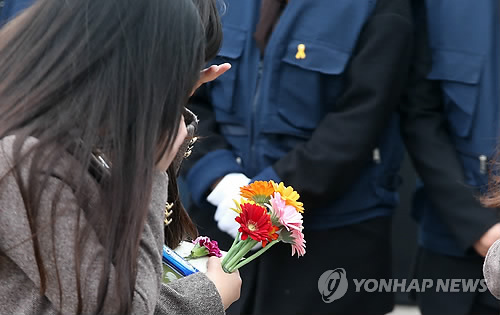 △ 꽃 들고 조문 순서 기다리는 단원고 학생들 (안산=연합뉴스) 신영근 기자 = 세월호 참사 1주년인 16일 오전 경기도 안산시 단원구 세월호 희생자 정부 공식 합동분향소를 찾은 단원고등학교 학생들이 조문 순서를 기다리며 울먹이고 있다. 2015.4.16 drops@yna.co.kr