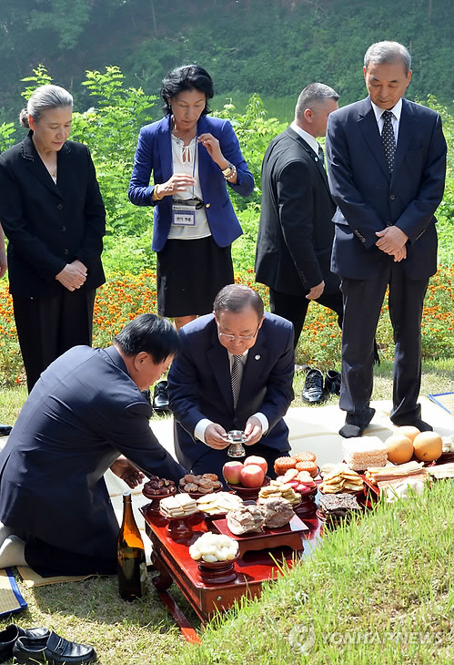 | △ 성묘하는 반기문 유엔 사무총장 (음성=연합뉴스) 노승혁 기자 = 반기문 유엔 사무총장과 부인 유순택 여사가 2013년 8월 25일 고향인 충북 음성군 원남면 상당리 행치마을을 방문, 아버지 묘소에서 성묘를 하고 있다. 2013.8.25 nsh@yna.co.kr |