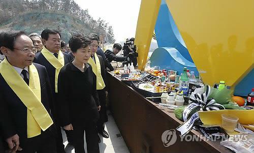 | △ 팽목항 방문한 박 대통령 (진도 청와대사진기자단=연합뉴스) 박근혜 대통령이 세월호 1주년을 맞은 16일 오후 전남 진도군 팽목항을 방문, 희생자와 실종자를 위해 마련된 추모 메시지와 음식들이 놓인 단 앞을 지나가고 있다. 2015.4.16 dohh@yna.co.kr (끝) |