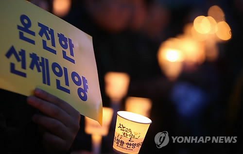 이들은 각자 "온전한 선체 인양", "정부시행령 폐기하라"고 적힌 종이와 촛불을 하나씩 들고 희생자들을 애도했다.