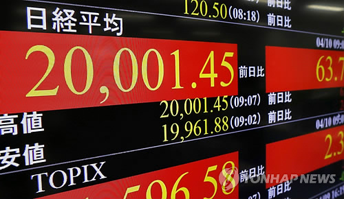 | △ 일본 닛케이 평균주가(닛케이 225)가 지난 10일 15년 만에 장중 20,000선을 돌파했다. 도쿄증시의 닛케이 주가는 이날 개장 직후인 오전 9시9분께 20,000선을 돌파, 2000년 3월 말 이후 15년 만에 20,000선 고지를 다시 밟았다. 사진은 10일 오전 일본 도쿄 히가시 신바시에 설치된 증시 현황판의 모습. (도쿄 교도=연합뉴스) |