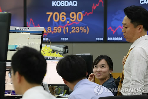 | △ 코스닥 700시대 (서울=연합뉴스) 이지은 기자 = 코스닥 지수가 7년 3개월 만에 700선을 돌파한 17일 오후 서울 중구 외환은행 본점 딜링룸에서 직원들이 대화를 나누고 있다. |