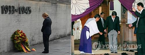 | △ 앙겔라 메르켈 독일 총리(사진 왼쪽,AP)가 2013년 8월 20일 다하우 나치 강제수용소를 방문해 헌화한 뒤 묵념하고 있다. 다하우 수용소는 1933년 나치에 의해 정치범 수용소로 세워졌다. 이곳에서는 1945년 4월29일 연합군에 의해 해방되기까지 20만명이 넘는 유대인과 정치범이 수용됐고 4만3천명 이상이 숨졌다. 오른쪽 사진(EPA)은 일본의 아베 신조(安倍晋三) 총리가 2012년 10월 17일 도조 히데키(東條英機) 등 제2차 세계대전 A급 전범이 합사된 야스쿠니(靖國) 신사를 참배한 뒤 나오는 모습이다.(AP EPA=연합뉴스DB) |