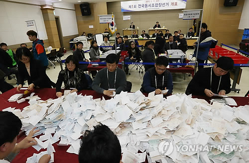 | △ 전국동시조합장 선거 개표 (춘천=연합뉴스) 이상학 기자 = 제1회 전국동시조합장 선거일인 11일 오후 강원도 춘천시 석사동 도여성가족연구원에서 선관위 직원들이 개표 작업을 진행하고 있다. 2015.3.11 hak@yna.co.kr |