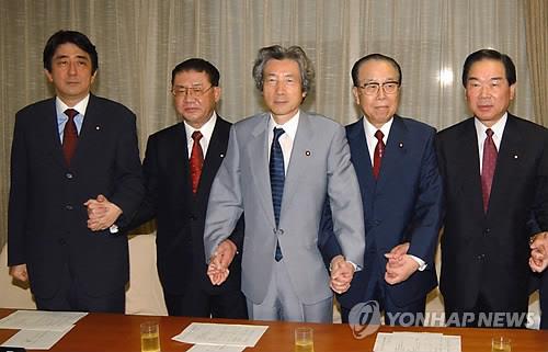 | △ 2003년 9월 21일 고이즈미 준이치로(小泉純一郞, 가운데) 당시 일본 총리 겸 자민당 총재가 일본 도쿄도(東京都) 자민당 본부에서 자민당 임시총무회의를 끝내고 아베 신조(安倍晋三, 왼쪽 첫 번째, 현직 일본 총재) 당시 간사장 등 주요 자민당 간부와 손을 잡고 있다. (교도=연합뉴스DB) |