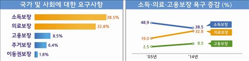 장애인들은 국가와 사회가 해주기 바라는 것으로 소득보장(38.5%), 의료보장(32.8%), 고용보장(8.5%)을 꼽았다. 2005년 조사때와 비교하면 소득보장(48.9%)을 원하는 목소리는 작아졌지만 의료보장(19.0%)이나 고용보장(2.5%)에 대한 욕구는 커졌다.