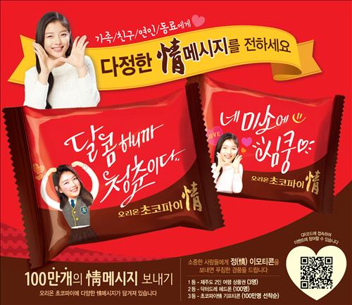 오리온은 또 새 포장지에 초코파이 모델 김유정의 모습과 함께 '넌 나에게 달달함을 줬어', '네 미소에 심쿵' 등 10종의 재치있는 메시지를 담았다고 덧붙였다.