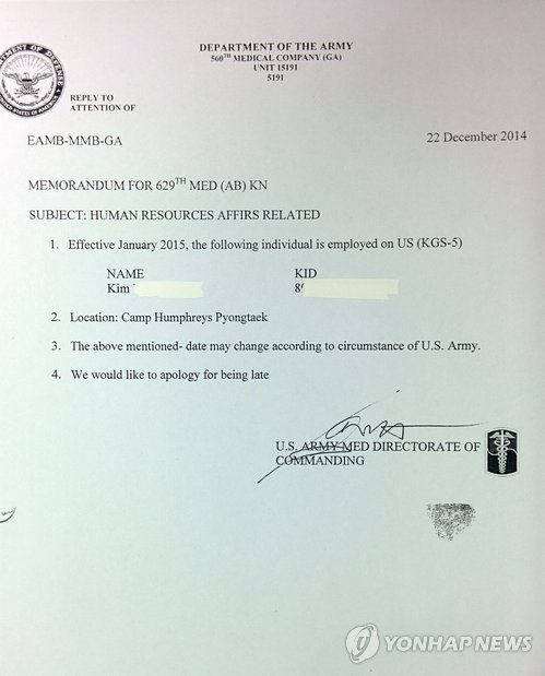 | △ 취업희망자를 속인 허위 인사발령장 (의왕=연합뉴스) 경기 의왕경찰서는 상습사기 등 혐의로 전 미군부대 소속 강모(55)씨를 구속했다고 20일 밝혔다. 강씨는 지난 2009년 10월부터 최근까지 의정부의 한 미군부대 내 구급차량팀에서 일할 당시 27명으로부터 취업을 미끼로 모두 8억원을 가로챈 혐의를 받고 있다. 강씨는 인사처장 명의로 된 발령장을 위조해 피해자들에게 나눠줬다. 2015.4.20 <<경기 의왕경찰서>> you@yna.co.kr |