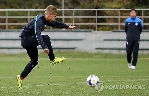 | △ 이승우 슈팅 지켜보는 안익수 감독. 18세 이하(U-18) 축구 국가대표팀 이승우가 20일 오전 파주NFC에서 훈련하고 있다. 오른쪽은 안익수 감독 대표팀은 JS파운데이션(이사장 박지성)의 주최로 수원월드컵경기장에서 개최되는 '2015 수원 JS컵 U-18 국제청소년축구대회'에 출전해 오는 29일 우루과이와의 1차전을 시작으로 다음 달 1일과 3일에는 각각 벨기에, 프랑스와 일전을 치른다. 2015.4.20 |