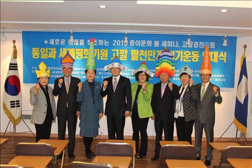 종이문화재단·세계종이접기연합(이사장 노영혜)은 우리의 유구한 역사와 전통인 고깔 접기를 세계에 알려 종이접기 주권을 찾는 동시에 국내외 8천만 겨레가 한마음으로 통일과 세계 평화를 기원하는 '고깔 8천만 개 접기 운동'의 시작을 알리는 발대식을 20일 서울 중구 장충동 종이나라빌딩에서 개최했다.