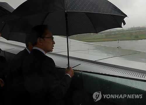 | △ 낙동강 둘러보는 MB (대구=연합뉴스) 김선형 기자 = 이명박 전 대통령이 20일 대구 달성군 강정고령보 디아크 전망대에서 낙동강을 둘러보고 있다. sunhyung@yna.co.kr |