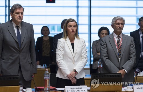 △ 룩셈부르크에서 열린 EU 특별 합동회의에 참석한 페데리카 모게리니 EU 외교안보 고위대표(가운데) (AP=연합뉴스)