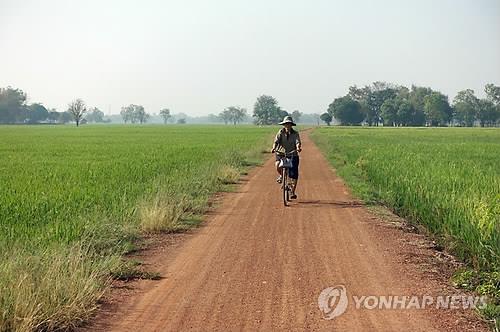 | △ (dpa=연합뉴스 자료사진) 농부가 태국 논 사이에 난 길을 자전거를 타고 지나가고 있다. |