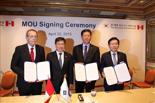| △ 한국수입협회와 코트라(KOTRA)가 20일(현지시간) 페루 수도 리마에서 페루수출협회(ADEX)와 경제교류협력 협약(MOU)을 맺었다. |