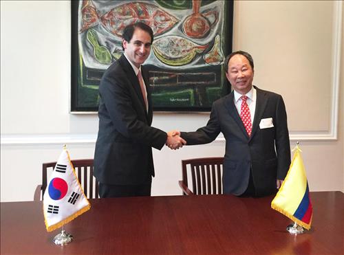 | △ 한국석유관리원 김동원 이사장과 콜롬비아 광물에너지부 토마스 곤잘레스 에스트라다 장관이 17일(현지시간) 콜롬비아 대통령궁에서 사업협력 양해각서(MOU)에 서명한 후 악수를 나누고 있다. |