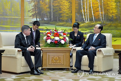 | △ 러시아 대법원 대표단 만난 김영남 (평양 조선중앙통신=연합뉴스) 김영남 북한 최고인민회의 상임위원장이 17일 만수대의사당에서 러시아 뱌체슬라프 레베데프 최고재판소 소장을 단장으로 한 러시아 대법원 대표단을 만났다고 조선중앙통신이 보도했다. 2015.4.17 photo@yna.co.kr |