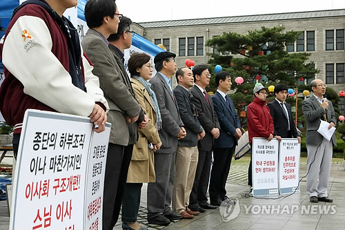 | △ 총장 반대 릴레이 단식 선포식 (서울=연합뉴스) 박영서 기자 = 동국대 교수협의회가 20일 오전 서울 동국대학교에서 '총장 반대 릴레이 단식 선포식'을 열고 있다. 동국대는 총장 선출을 놓고 종단개입과 후보자의 논문 표절 논란이 불거지며 내홍을 겪고 있다. 2015.4.20 conanys@yna.co.kr |