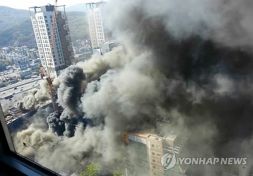 | △ 치솟는 검은연기 (성남=연합뉴스) 경기도 성남시 분당구의 한 신축 공사 현장에서 원인을 알 수 없는 불이 나 수십명이 대피하는 등 소동이 빚어졌다. 21일 오후 3시 30분께 경기도 성남시 분당구 정자동 국립국제보육원 공사현장에서 불이 나 출동한 소방대에 의해 약 50분만에 큰 불길이 잡혔다. 소방당국은 이 불로 공사장에 있던 90여명이 대피했으며, 5명은 단순연기흡입으로 부상했다고 전했다. 사진은 인근 건물에서 찍은 화재 현장. 2015.4.21 <<독자 제공>> you@yna.co.kr |