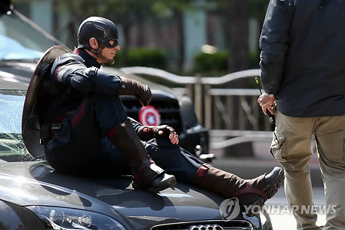 △ 촬영 중인 크리스 에반스 (서울=연합뉴스) 김수진 기자 = 할리우드 배우 크리스 에반스가 4일 오전 서울 마포구 상암동 DMC 월드컵북로에서 진행된 '어벤져스:에이지 오브 울트론' 촬영장에서 촬영을 준비하고 있다. 2014.4.4 ksujin@yna.co.kr
