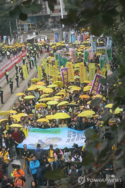 △ 홍콩서 우산혁명 이후 최대 거리 행진 (홍콩=연합뉴스) 최현석 특파원 = 시민운동단체 민간인권진선은 1일 오후 시민 수천명을 이끌고 홍콩섬 코즈웨이베이 빅토리아 공원을 출발, 센트럴까지 행진하며 '정치적 제한 없는 행정장관(행정수반) 직선제' 실시를 요구했다. 이날 시위는 작년 12월 15일 끝난 79일간의 도심 점거 시위 이후 최대 규모로 기록됐다. 2015.2.1 <<국제뉴스부 기사 참조>> harrison@yna.co.kr