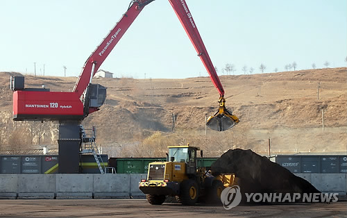 △ 남·북·러 물류 협력 사업인 나진-하산 프로젝트의 사업 타당성을 확인하기 위해 진행된 러시아 시베리아산 유연탄 선적작업이 지난해 11월 27일 나진항에서 이뤄지고 있다. (연합뉴스 자료사진)