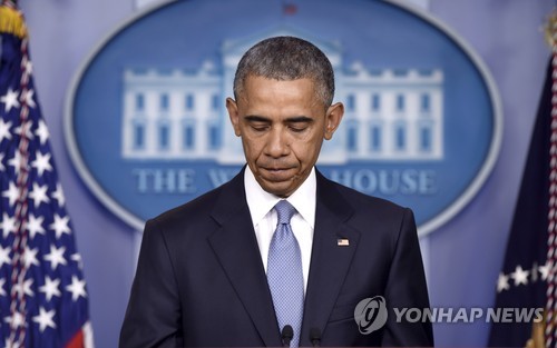 | △ (AP=연합뉴스) 버락 오바마 미국 대통령이 23일(현지시간) 긴급 연설을 통해 인질 사망에 애도를 표시하면서 침통한 표정을 짓고 있다. |