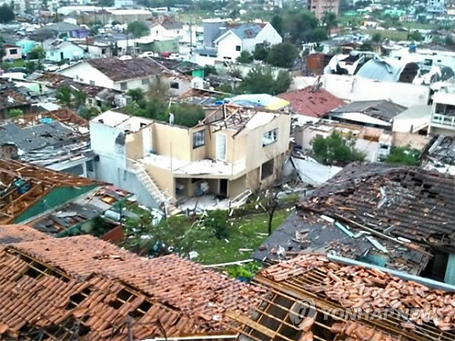 | △ 토네이도 흔적 역력한 브라질 샨세레 (샨세레<브라질> EPA=연합뉴스) 21일(현지시간) 토네이도가 강타한 브라질 산타카타리나주 서부 샨세레의 주택들이 지붕이 날아간 채 부서져 있다. 전날 오후 시속 200㎞를 넘는 강력한 바람을 동반한 토네이도가 산타카타리나주의 10여 개 도시를 휩쓸고 지나갔고, 가장 큰 피해를 본 샨세레시에서는 2명이 사망하고 120여 명이 다쳤으며 이재민은 1천여 명에 달하는 것으로 알려졌다. 2010596@yna.co.kr |