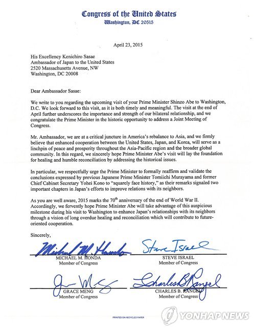 에드 로이스(공화·캘리포니아) 하원 외교위원장과 마이크 혼다(민주·캘리포니아)를 비롯한 민주·공화당 소속 의원 25명은 이날 "아베 총리는 역사를 직시하면서 무라야마 담화와 고노 담화를 공식으로 재확인하고 인정하라"는 취지의 연명서한을 작성, 사사에 겐이치로 주미 일본대사에게 보냈다.