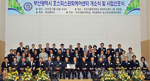 △ 부산서 전국 첫 공공형 생애 말기 돌봄 서비스 (부산=연합뉴스) 24일 부산가톨릭대에서 열린 '호스피스 완화 케어센터' 개소식에 참석한 주요 인사들이 기념촬영을 하고 있다. 2015.4.24 << 부산시 제공 >> youngkyu@yna.co.kr